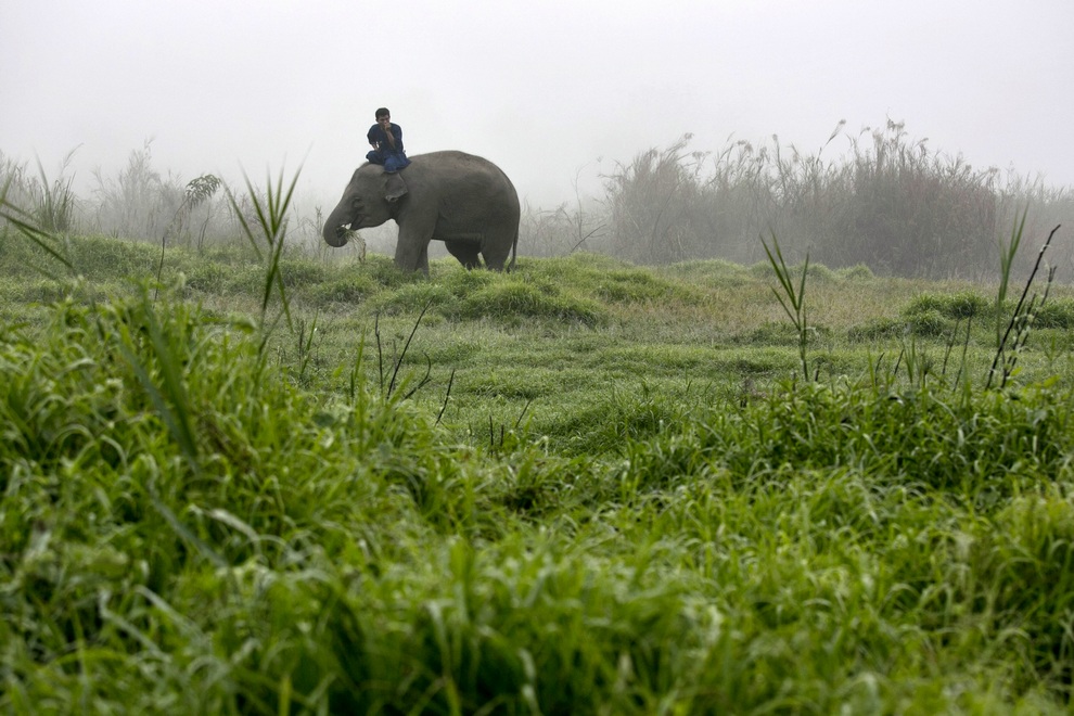 Махут (человек, который ездит на слонах) гуляет со своим слоном ранним туманным утром. В это время слоны наедаются травы на лугах. (Paula Bronstein/Getty Images)