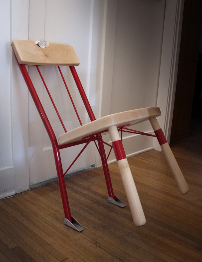 Who’s There — стул-запор Автор заметил, что стул используемый в фильмах как запор от нежелательных гостей, не работает в действительности. Он решил сделать модель стула, который на самом деле можно использовать как замок. Задняя часть сделана из металла. Верхняя деревянная панель со специальной выемкой для дверной ручки. К ножкам приделаны упоры с прорезиненными накладками, чтобы стул не скользил по полу.