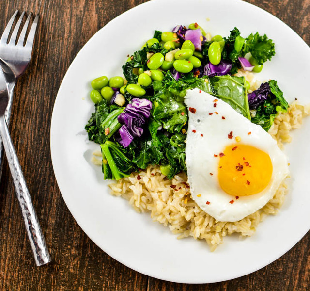 Вкусный белок с углеводами. Вам понадобятся рис, яйца, красная капуста, брокколи, зеленый перец и соевый белок. Сытный и полезный завтрак.