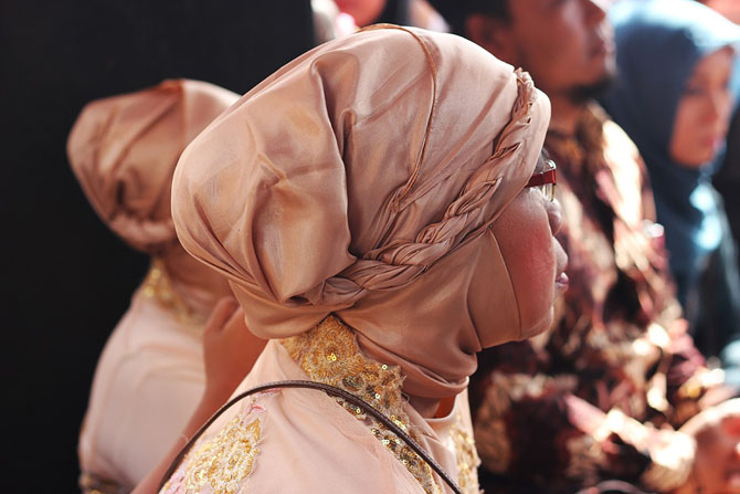 Все женщины и девочки одеты в кабайю (от арабского «kaba» — одежда) — длинное расшитое платье — и красиво завязанный платок, так что видно лишь напудренное лицо и яркую помаду. Даже самые маленькие гостьи делают яркий макияж. Мужчины — в традиционных рубашках из батика с длинными или короткими рукавами. Говорят, в 90-х годах на свадьбу было принято дарить венок из цветов, на котором выложено пожелание новобрачным, и разную домашнюю утварь, да так, что у молодоженов в итоге было несколько одинаковых подарочных миксеров, телевизоров и прочего. Сейчас же на столе при входе в дом, где проходит церемония, стоит коробка, куда складывают конверты с подарком в денежном эквиваленте. Также в руках гостей можно увидеть коробки с тортами и кульки, полные конфет. После выступления отца и брата невесты на сцене с микрофоном в руках все перемещаются в шатер, где в центре сидит жених, а напротив него имам. Позже появляется невеста.
