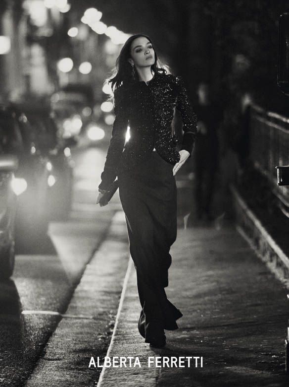 Черно-белые снимки редко используются в рекламных целях. Но у Alberta Ferretti такое цветовое решение очень уместно. Ночь. Девушка. Элегантность. Про такие снимки можно стихи писать. А как завораживает героиня! Кажется, она такая уверенная, независимая и счастливая! И гулять ночью становится приключением.