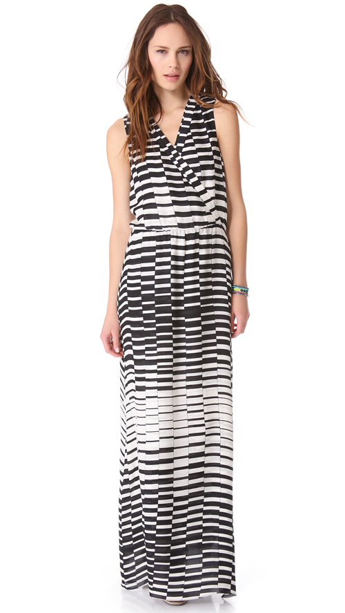 Актуальный графичный принт, особенно полоска, расположилась и на длинных летних платьях. Но будьте осторожны — такие принты визуально могут придать объем.