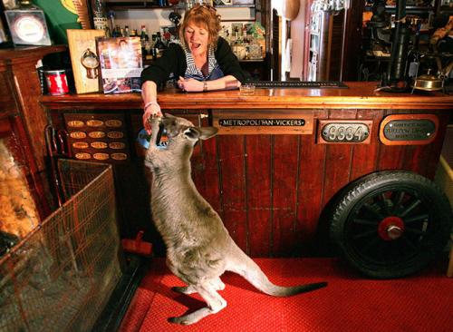 Кенгуру пьёт пиво в баре гостиницы в городе Хартли Вейл, Австралия.