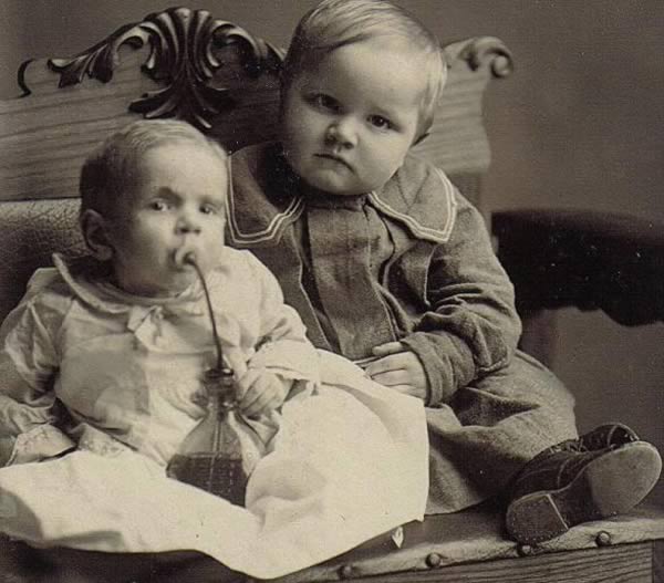 На фото: ребенок пьет из банджо-бутылочки конца 1800 годов (круглой плоской формы). Бутылочка сделана из стекла с резиновой трубочкой и соской. Позже эта бутылочка была осуждена докторами, как негигиеничная — ее резиновую трубочку невозможно было вымыть. Эти бутылочки пользовались огромной популярность, так как у каждой было название «Мой маленький зверек» или «Мамино счастье». На фоне стандартных в ту пору названий как «Империя», «Национальный» и «Викторианский», эти названия звучали очень мило.