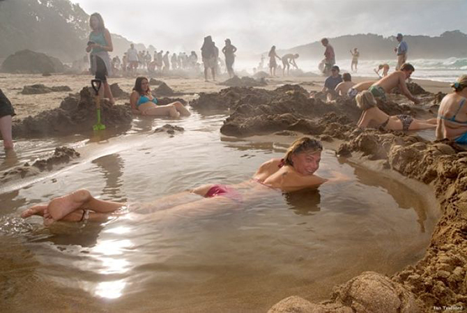 Пляж с «горячим водоснабжением», полуостров Коромандел, Новая Зеландия. Поезжайте на этот пляж, вооружившись лопатой, поскольку самое лучшее, что здесь можно сделать – это выкопать собственный минеральный источник ручной работы. Температура воды на этом геотермальном пляже достигает шестидесяти четырех градусов. Горячая вода бьет из двух подземных источников, расположенных недалеко от пляжа. Прежде чем отправиться принимать целебные минеральные ванны, стоит уточнить прогноз температуры и качества воды на специальном веб-сайте.