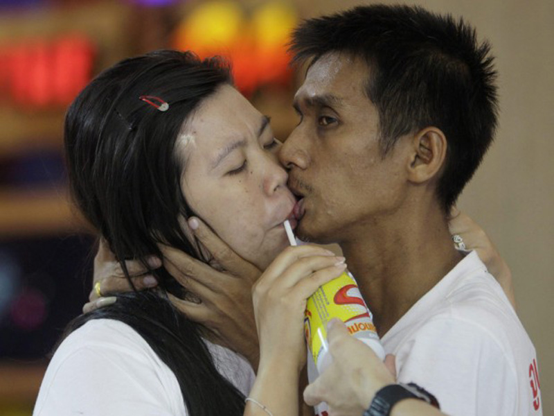 Лакшана Тиринара взбадривается энергетическим напитком в ходе попытки побить мировой рекорд по самому долгому поцелую, Паттайе, юго-восточный Таиланд, 14 февраля.