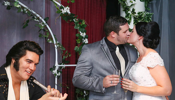 Пара после помолвки целуется возле восковой фигуры Элвиса Пресли в музее мадам Тюссо. Сидней, Австралия
