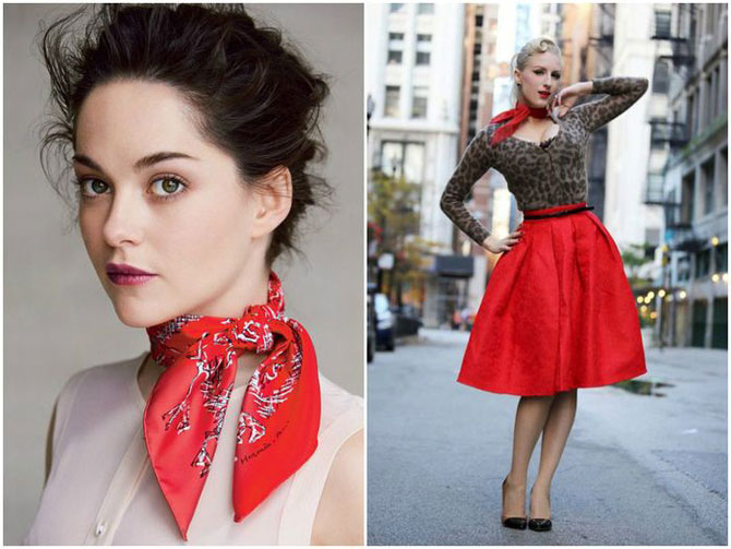 Вместо колье, цепочек и ожерелий модельеры советуют носить нашейные платки. Такой небольшой аксессуар может выступать цветовым пятном в спокойном и монотонном образе. Он хорошо смотрится с элегантным деловым костюмом, с джинсами и свитером, и даже с лёгким романтичным платьем.