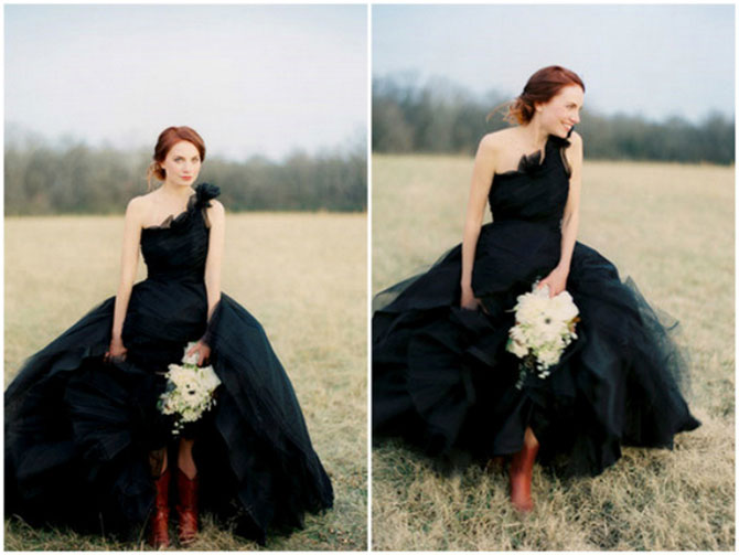 Длинное пышное свадебное платье чёрного цвета подойдёт смелой невесте, которая любит быть в центре внимания и равнодушна к мнению посторонних.