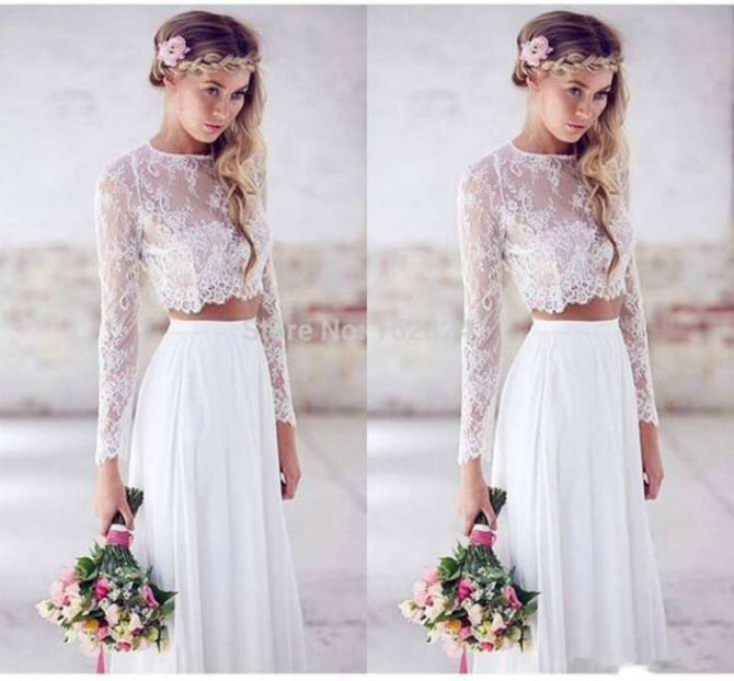 Белоснежный топ из тонкого полупрозрачного кружева в сочетании с длинной юбкой – один из трендов современной свадебной моды.