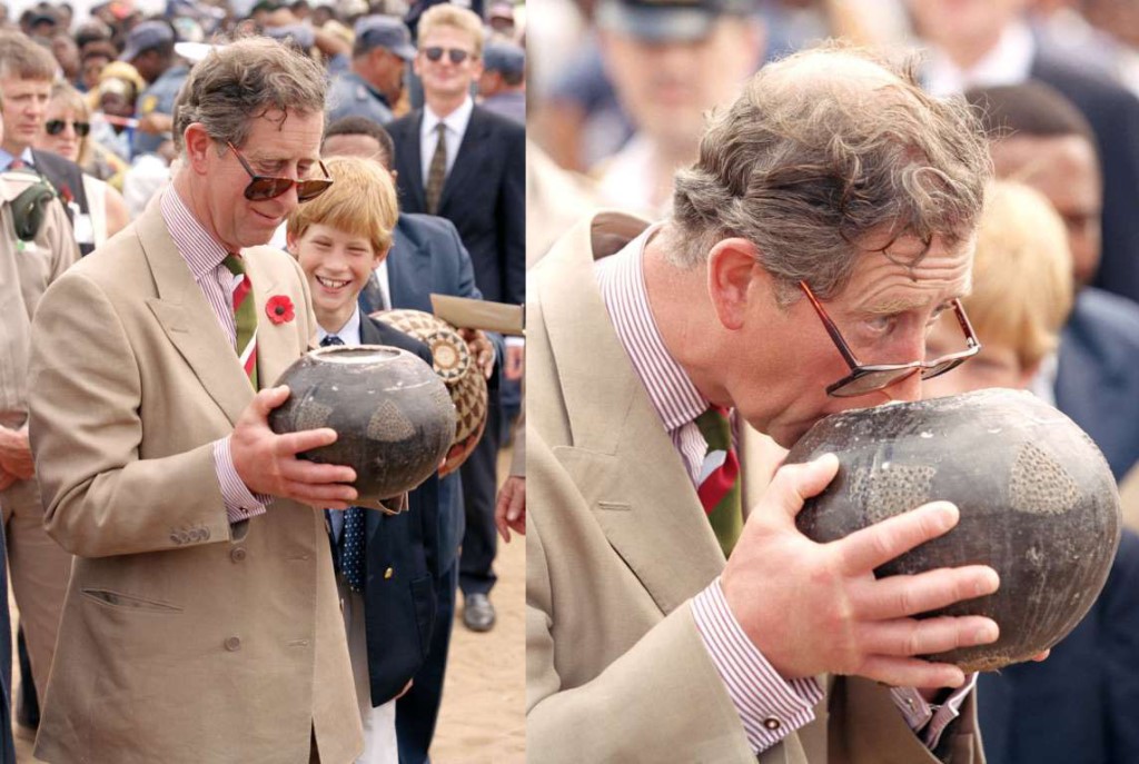 Нелегко быть принцем! Особенно когда приходится пробовать угощение в африканской деревне! Принц Уэльский и юный принц Гарри в деревне зулу во время визита в Южную Африку. (Фото: ark Cuthbert / UK Press / Getty Images)