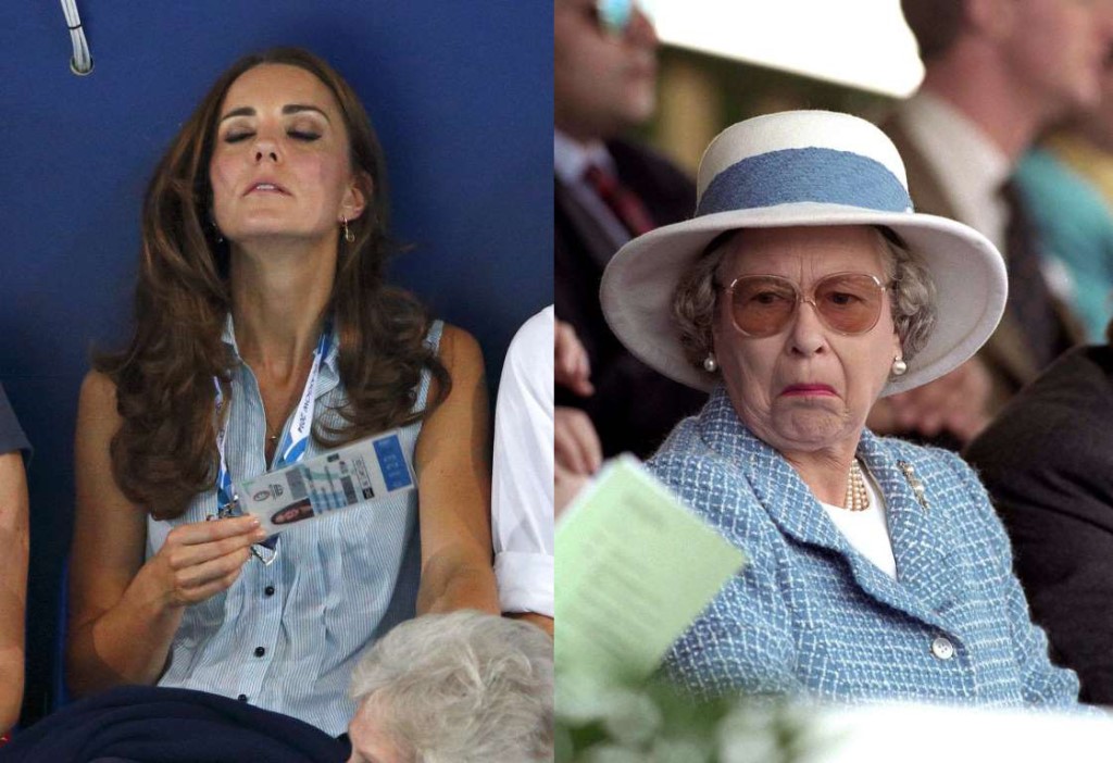 Герцогиня Кейт обмахивается карточкой посетителя во время соревнований по плаванию на Играх Содружества в Глазго. Что за манеры? Какое удивление на лице королевы Елизаветы II. (Фото: Max Mumby / Indigo / Getty Images, Tim Graham / Getty Images)