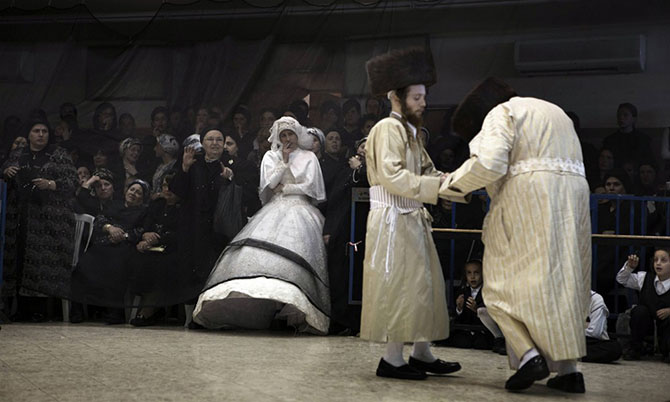 Невеста наблюдает, как её жених-иудей танцует с ребе из ультраортодоксальной общины во время их свадьбы в Иерусалиме. Ритуал в конце свадьбы исполняемый членами общины и семьи — это танец перед невестой.