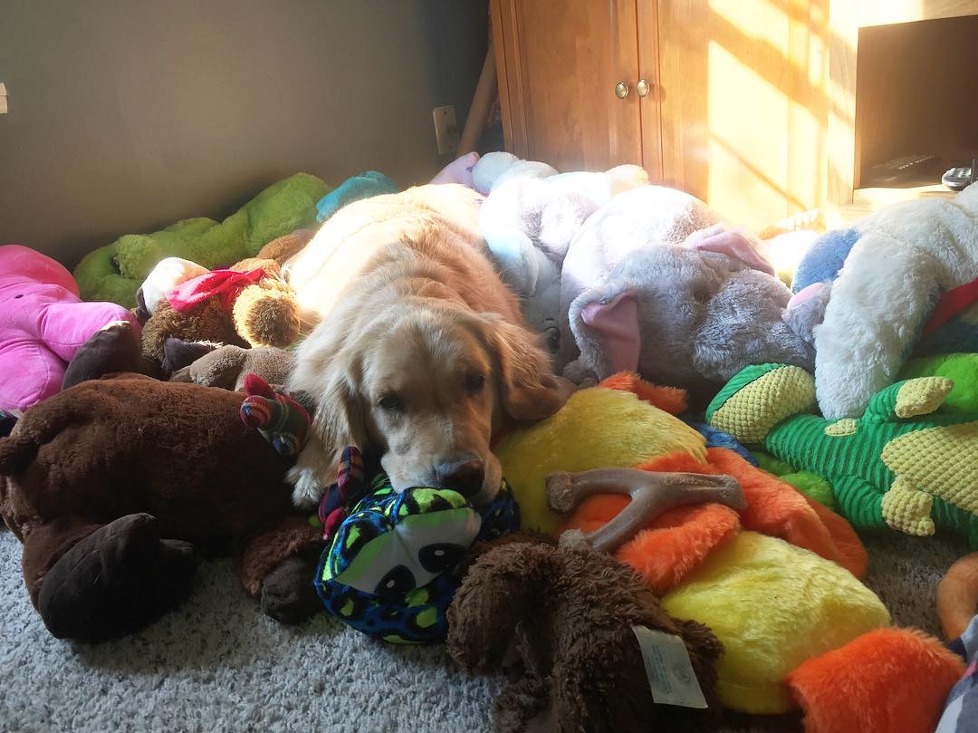 Собака, работающая терапевтом, тщательно выбирает игрушки для сна каждый день. Фото