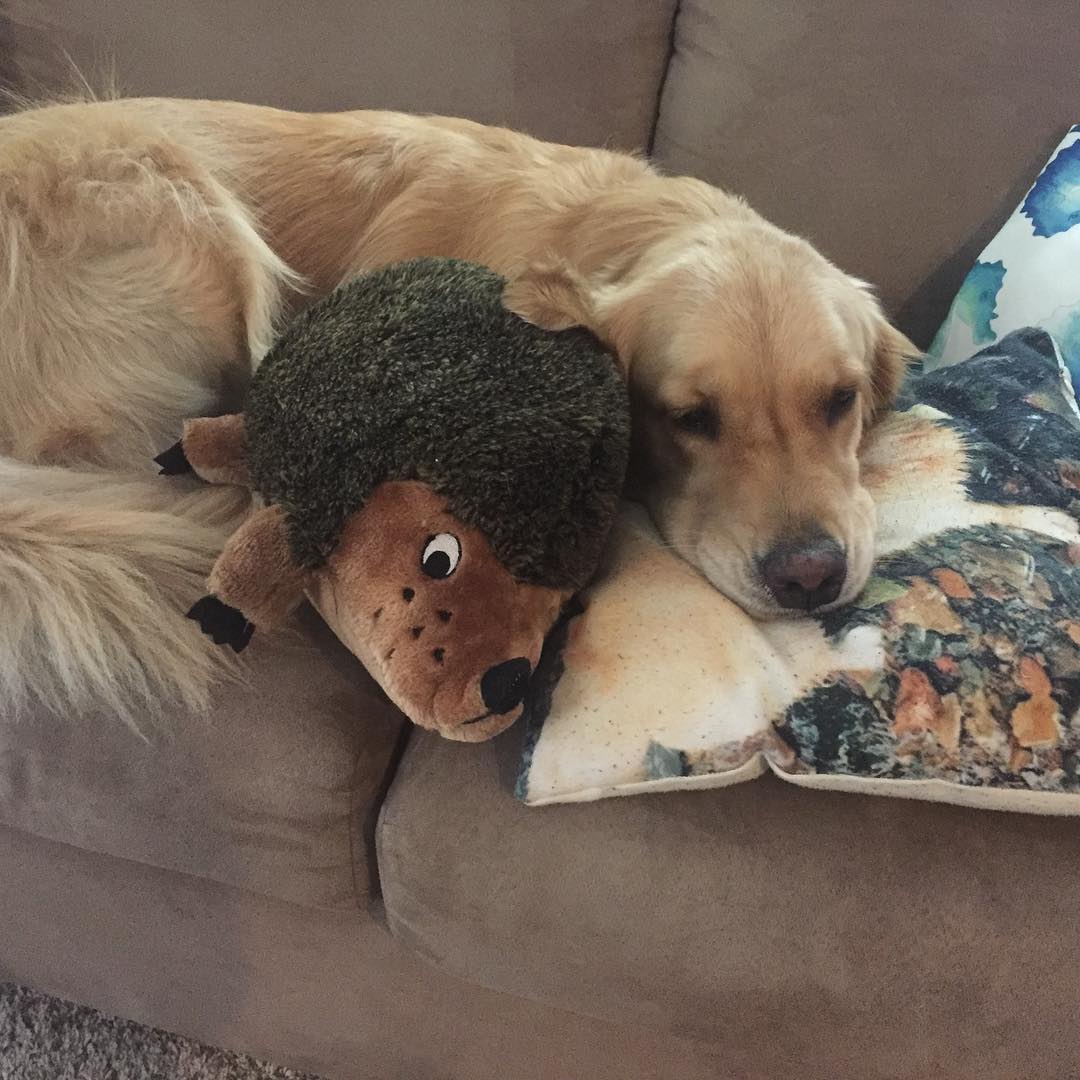 Собака, работающая терапевтом, тщательно выбирает игрушки для сна каждый день. Фото
