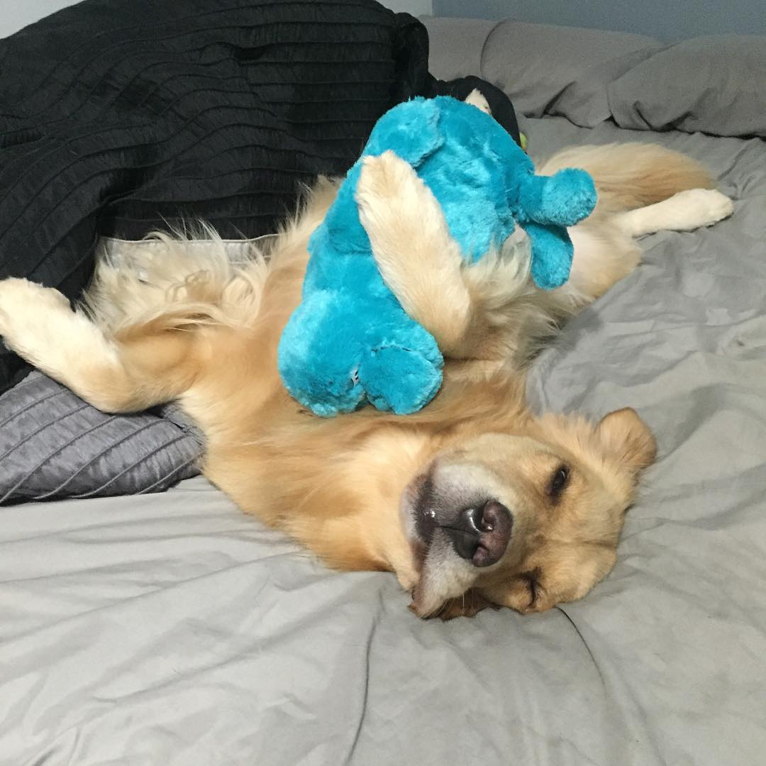 Собака, работающая терапевтом, тщательно выбирает игрушки для сна каждый день. Фото