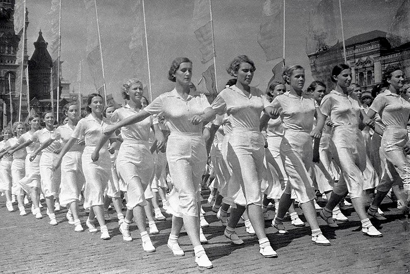 Небольшой рассказ о фото-образе советской женщины. Здесь можно выделить два больших исторических периода: героический и лирический. Первый продолжался до середины 1950-х гг. Мейнстримом в советском фотоискусстве был монументально-героический образ советской женщины – активной строительницы коммунизма: спортсменки, комсомолки, ударницы или даже воина сообщает *Настроение* по материалам сайта *Новости в фотографиях* Шагин вообще создал целую галерею героических образов современниц. Наиболее ярко дух этого направления передаёт знаменитое фото Ивана Шагина «Парад физкультурников на Красной площади» 1936 г.