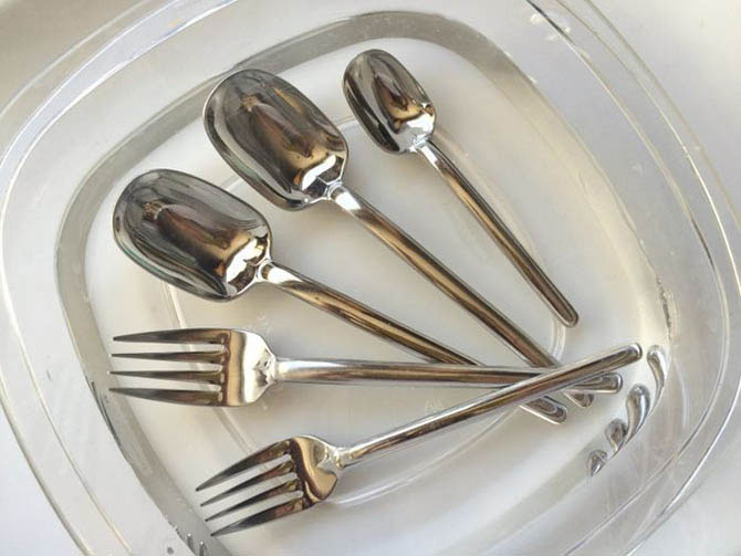 Бывает так, что после мытья ложки, вилки и ножики становятся тусклыми и вовсе теряют блеск. Как же это предотвратить? После того, как они будут полностью очищены при помощи тёплой воды и моющего, их следует почистить небольшим количеством пищевой соды, смыть её и протереть приборы сухой салфеткой до блеска.
