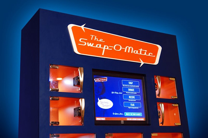 Торговый автомат «Swap-O-Matic» объединяет множество людей для общей пользы. Вот как это работает: вы приносите ставшие ненужными вещи в хорошем состоянии к автомату, затем машина оценивает вещь и даёт вам определённое количество баллов за единицу пожертвования, и позже вы сможете использовать эти баллы для того, чтобы купить вещь, пожертвованную кем-то другим. Это экологически чистая концепция, способствующая утилизации ненужных вещей, но с предоплатой. Производитель заявляет: «Благодаря силе дизайна и технологий мы взяли нечто вневременное, но простое — обмен — и превратили его в запоминающуюся игру. Автомат поможет людям переосмыслить нынешние потребительские привычки». Браво, «Swap-O-Matic»! Серьёзно, это отличная идея, хотя нет никакого способа предугадать, насколько странные вещи могут быть в итоге пожертвованы.