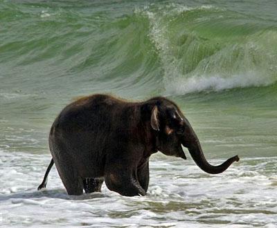 Внезапно маленький слоненок побежал в море… и начал плескался, как ребенок, в волнах.