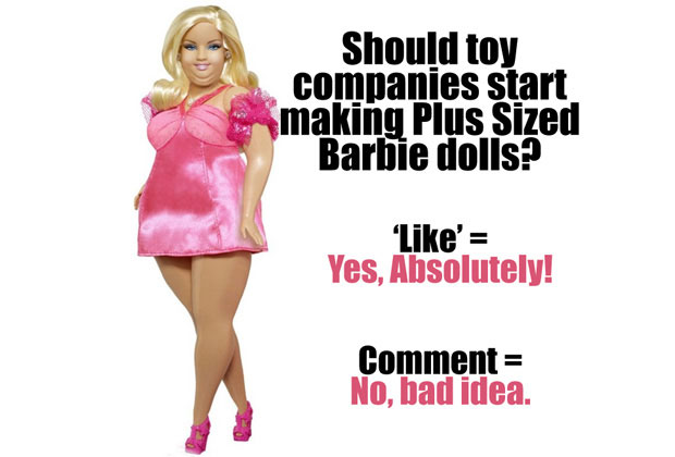 Разразилась война: активисты собирали сотни подписей к онлайн-петициям с требованиями сделать, в конце концов, куколку похожей на реальную девушку, а не тростинку с огромными глазами и «неестественно гладкой» кожей. С Барби боролись и будут бороться не только петициями, но и более простыми и наглядными способами. Например, администраторы группы Plus Size Modeling в соцсети Facebook, представляющие движение «пышных» фотомоделей, с помощью фотошопа добавили совершенной кукле пару десятков килограммов. У блондинки появились три подбородка и корпулентные конечности. Авторы идеи предложили подписчикам проголосовать лайками, стоит ли Mattel приступить к выпуску такой куклы вместо существующей.