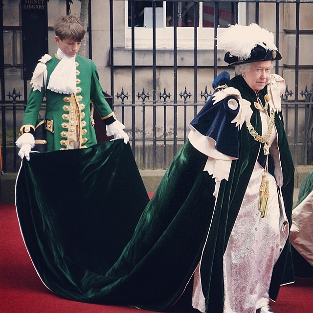 На некоторые мероприятия королева надевает традиционный костюм. На этой фотографии вы видите экстравагантный изумрудный бархатный плащ.