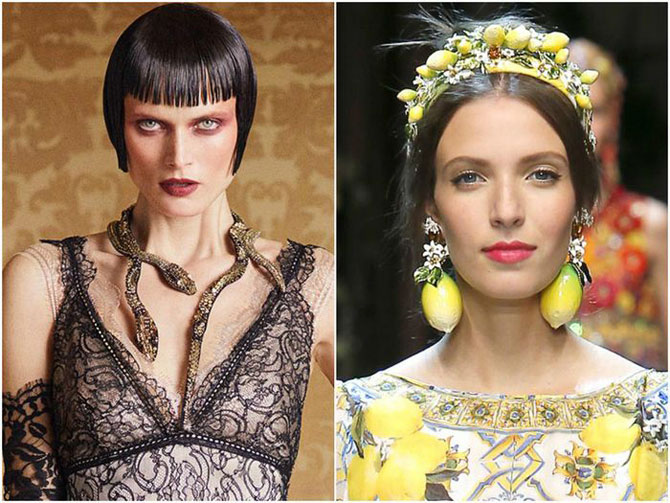 Уйти от стандартов и стать неординарной – вот, что советуют делать модницам мировые дизайнеры. Они предлагают украшать себя аксессуарами, в которых присутствуют необычные и яркие мотивы. Некоторые включают в свои коллекции серьги в виде массивных фруктов, а другие делают змеевидные тиары и колье.