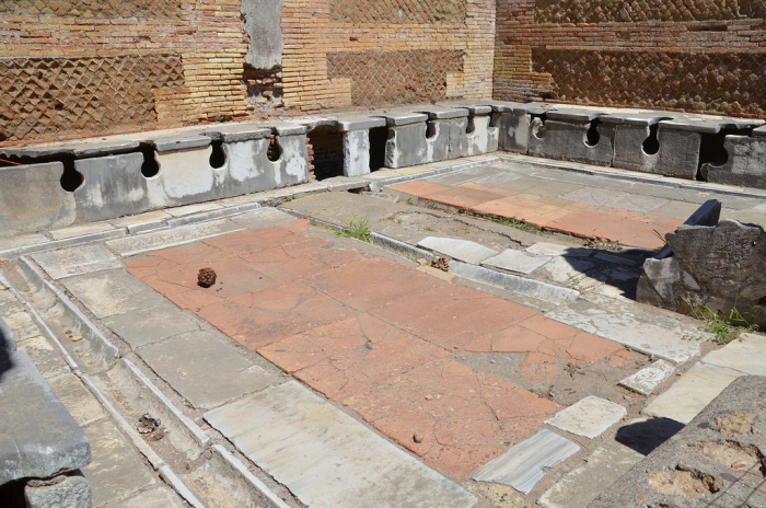В Древней Греции воспевались бои на горшках, а римляне подошли к туалетной теме с большим размахом. Латрины – общественные уборные – строили в великом множестве. Эти заведения выглядели как комнаты, по периметру которых располагались чаще каменные, реже – деревянные сиденья с отверстиями, похожими на замочные скважины. Скамьи располагались над канализацией. Нечистоты Рима смывались проточной водой из терм и по небольшому каналу соединялись с основной рекой сточных вод, громадной Cloaka Maxima, а затем попадали в Тибр.