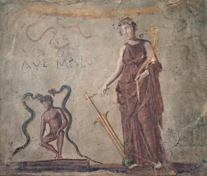 Фреска из коридора, ведущего в латрину, изображает Исиду. Надпись гласит: «Cacator cave malum» – «Какающий, остерегайся зла» (Неаполитанский археологический музей)./Фото: followinghadrian.files.wordpress.com