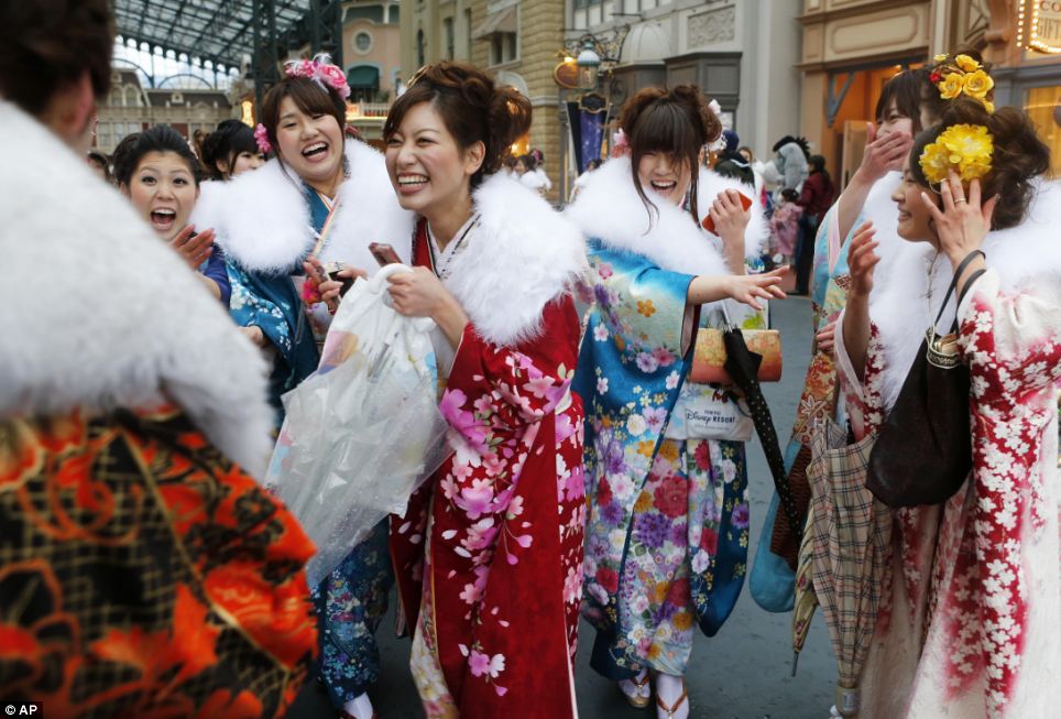 В токийском Диснейленде девушки, достигшие 20-летнего возраста, празднуют вступление во взрослую жизнь в традиционных кимоно и… с мобильными телефонами в руках. Национальный японский праздник – День совершеннолетия (или Сейджин но хи) в его современной версии ежегодно отмечается во второй понедельник января с 1948 года. Официальные мероприятия с участием родителей и длинными речами об ответственности взрослых людей в обществе организуются правительством. После этого многие «новоиспеченные взрослые» со всей семьей посещают храм, а позже отправляются веселиться с друзьями сообщает *Настроение* по материалам сайта *Новости в фотографиях* Традиции и современность: девушки надевают традиционные кимоно Фурисодэ, стоимость которых может превышать $10.000, и сандалии гэта, но уже никак не могут обойтись без своих мобильных телефонов. Новые обязанности: достигнув 20-ти лет, японцы могут голосовать и покупать алкоголь и сигареты. За преступления теперь также придется отвечать по всей строгости закона.