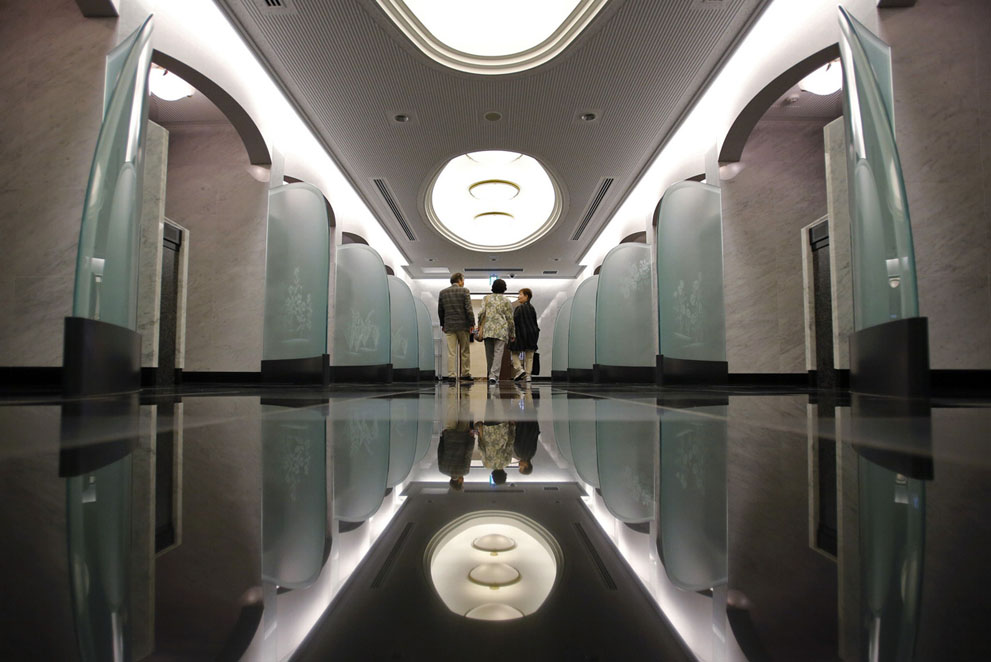 Люди гуляют по многоэтажному кладбищу в центре Токио после посещения похорон своего родственника при жизни, 27 октября 2014.