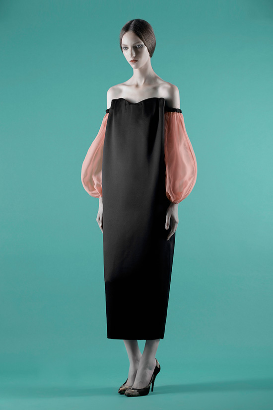 Платье-кокон с рукавами из органзы — отголоски 60-х годов, но благодаря строгому крою наряд выглядит футуристичным. Такая интересная смесь прошлого с будущим.