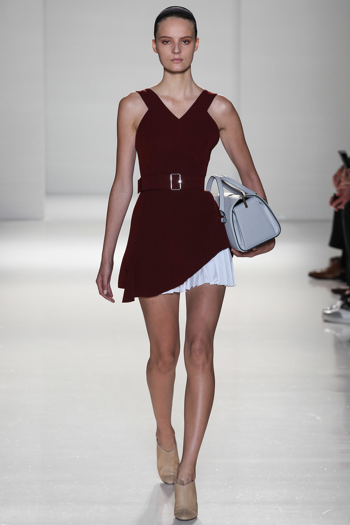 Уже несколько сезонов цвет бургунди на пике популярности. И какие только сочетания дизайнеры не представляли, но с белым мы не видели. Асимметричное бордовое платье, из под которого виднеется кусок белой плиссированной юбки — эту вещь мы еще не раз увидим на знаменитостях.