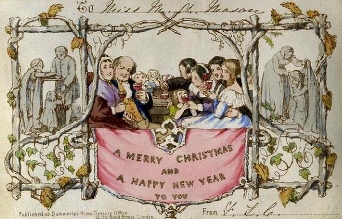 В 1843 году сэр Генри Коул из Лондона решил сделать что-то принципиально новое на Рождество. В прошлом, как и многие другие, он отправлял письма друзьям, членам семьи и клиентам по бизнесу, но в 1843 году он удивил всех праздничной поздравительной открыткой. Он заказал художнику Джону Колкотту Хорсли дизайн этой открытки, которая представляла собой триптих.