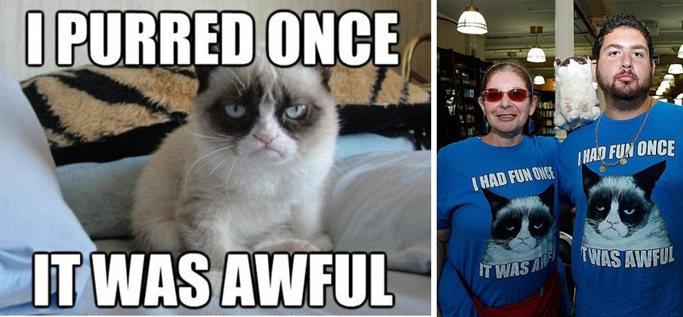 Еще одним мощным источником продвижения будущей звезды Интернета стал YouTube. Размещенный два года назад ролик посмотрели 15 миллионов 700 тысяч человек! Такая слава не снилась даже Джастину Биберу. «Я смогла оставить свою работу официантки всего через несколько дней после того, как изображение моего кота появилось в соцсетях, – вспоминает Табата, – Мой телефон просто не умолкал – мне безостановочно звонили с предложениями». Grumpy Cat родился с неправильным прикусом – и именно это отклонение и обеспечило фирменную угрюмость его физиономии. Так дефект природы обернулся для котика всемирной славой.
