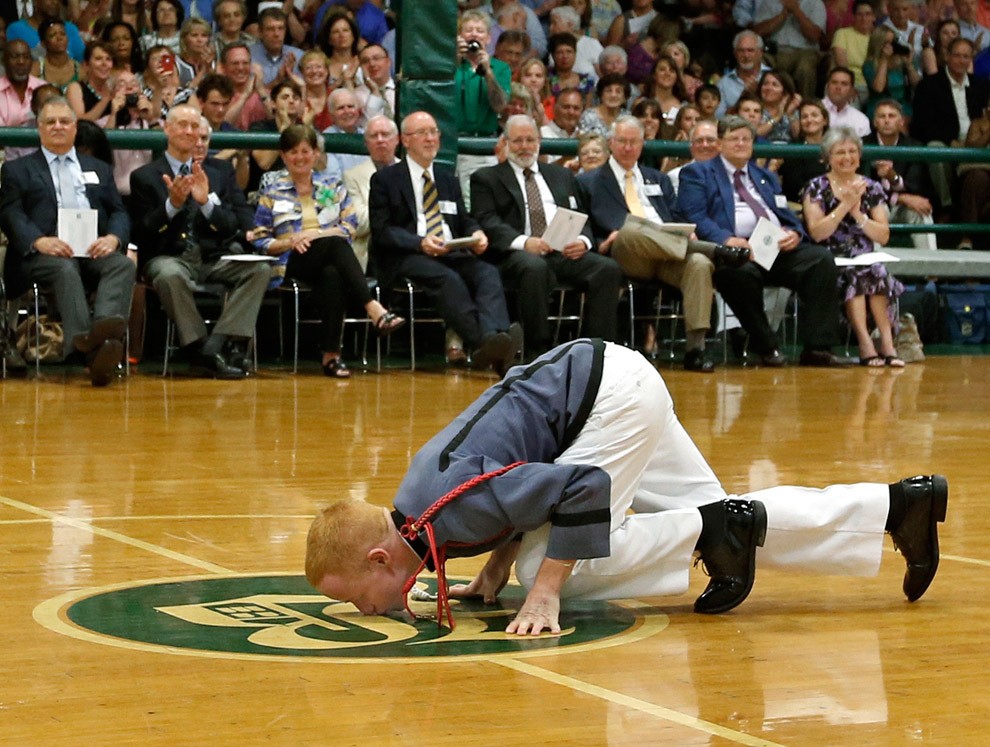 Выпускник Benedictine College Preparatory Academy целует эмблему своего учебного заведения на полу спортивного зала перед получением диплома в Ричмонде, штат Виргиния, 31 мая.