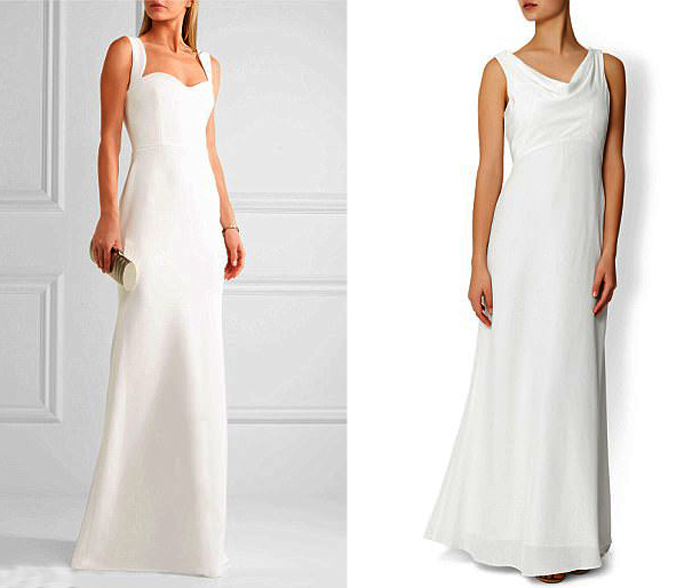 Слева: Платье от Victoria Beckham, которое подчеркивает женские изгибы тела и акцентирует внимание на груди с помощью декольте в форме сердца, обойдется вам в $4 200. Справа: Платье простого силуэта с акцентом на декольте. Наряд создан фирмой Monsoon’s Hartley и стоит $370.