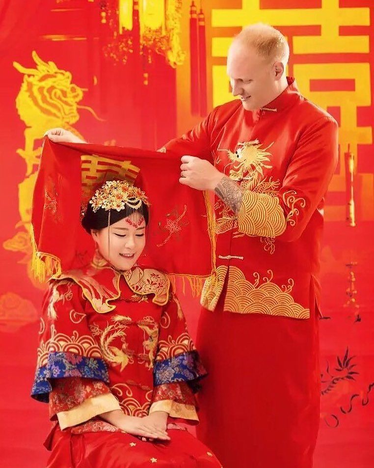 Традиционный цвет китайской свадьбы — красный. А белый символизирует время для скорби и похорон. После церемонии жених убирает красную вуаль с головы невесты.