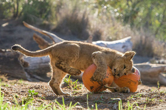 Африканский львенок Эрнест играет с тыквой в зоопарке Сан-Диего, штат Калифорния.