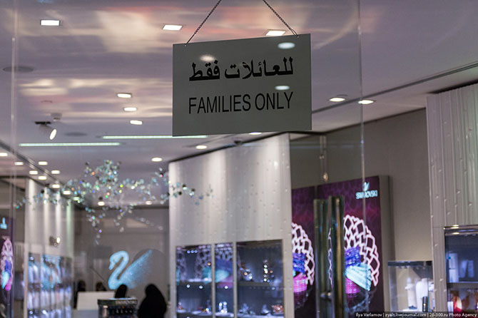 Часто в ресторан даже разные входы для мужчин и женщин. Секция для мужчин маленькая, там как правило всего несколько столов, отдельные кассы. С другой стороны вход в семейную секцию, которая, как правило, большая. В ресторанах эти столики закрыты шторками – там женщины могут открывать лицо, чтобы есть. Во многих магазинах FAMILY ONLY подразумевает вход только женщинам, потому что туда могут входить «чужие» женщины, которых не может видеть мужчина. Во многие парки пускают только женщин или семьи, в супермаркетах большинство касс не обслуживают одиноких мужчин. В некоторых магазинах есть целые этажи, куда мужчин не пускают. В гостиницах тоже часто делают отдельные женские этажи, куда мужчинам вход закрыт.